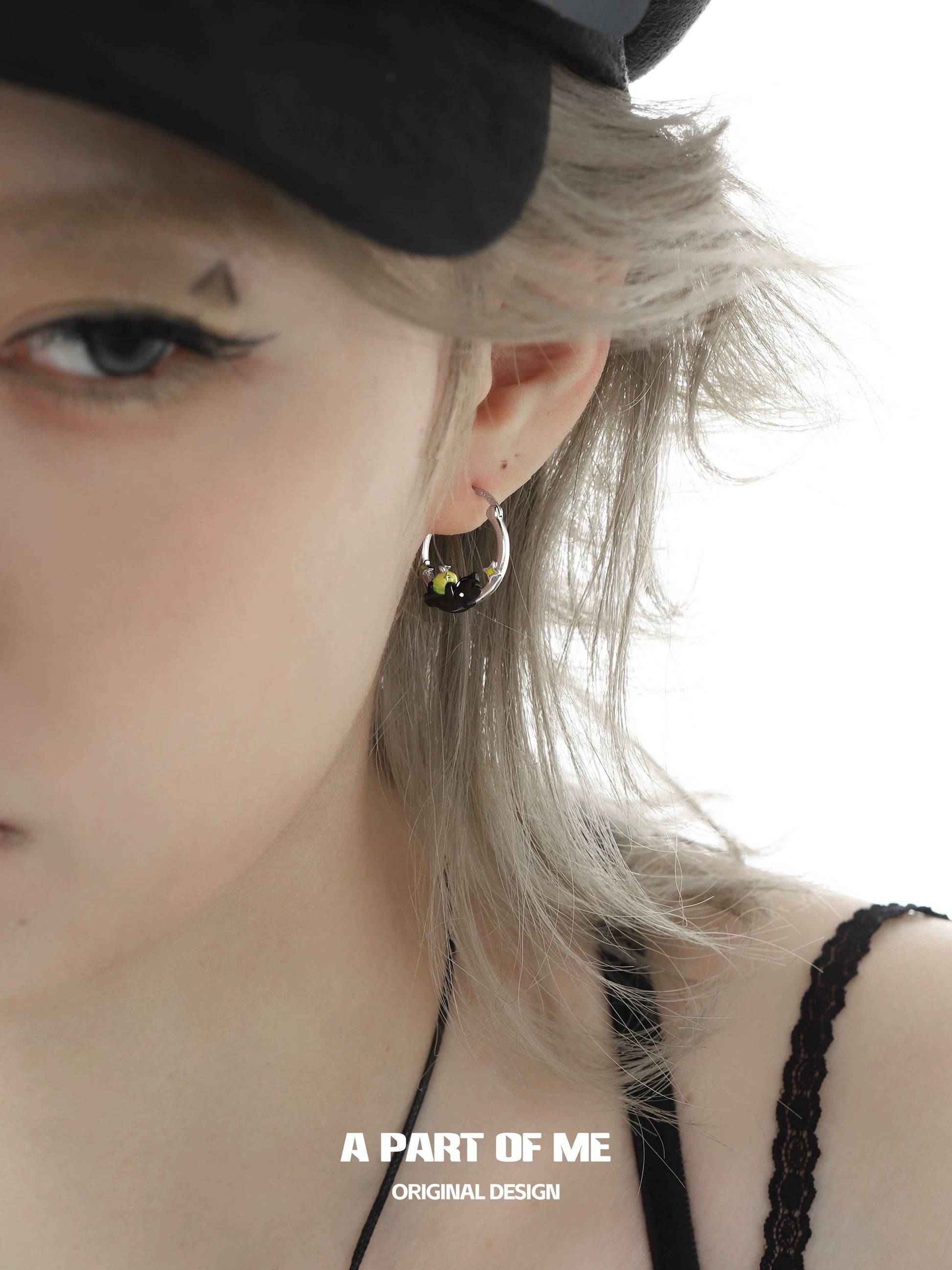 Apple Cat 18K Platinum Plating Black Cat & Green Apple Hoop Earrings