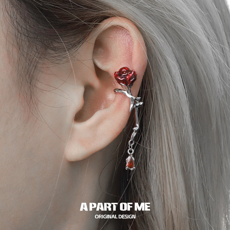 Designed to hug the ear delicately, the vivid red rose symbolizes love and resilience, beautifully complemented by the gleaming zircon stones. The seamless, wrap-around structure ensures a bold yet graceful statement.