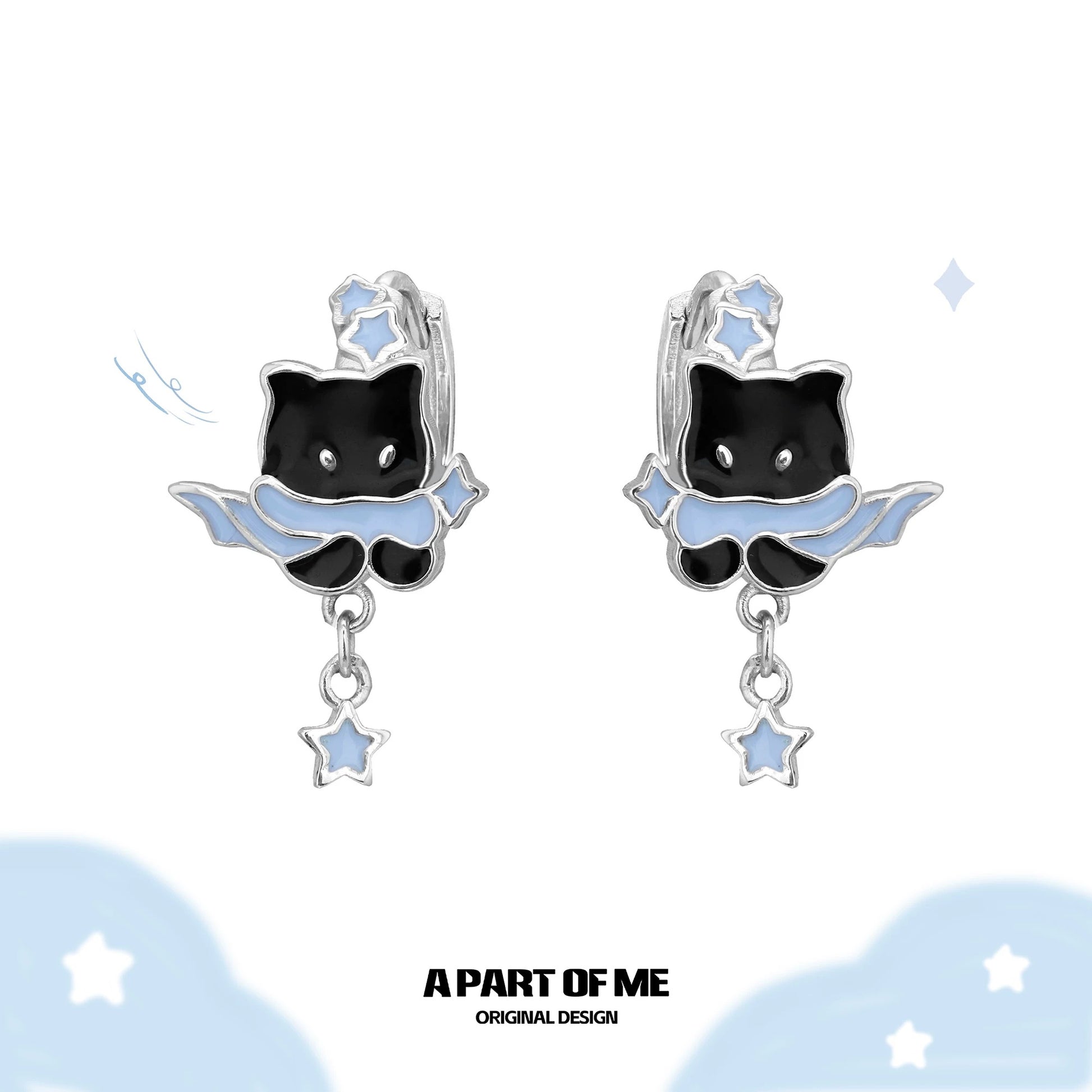 Snowy Black Cat & White Dog 18K Platinum Plating Huggies Earrings