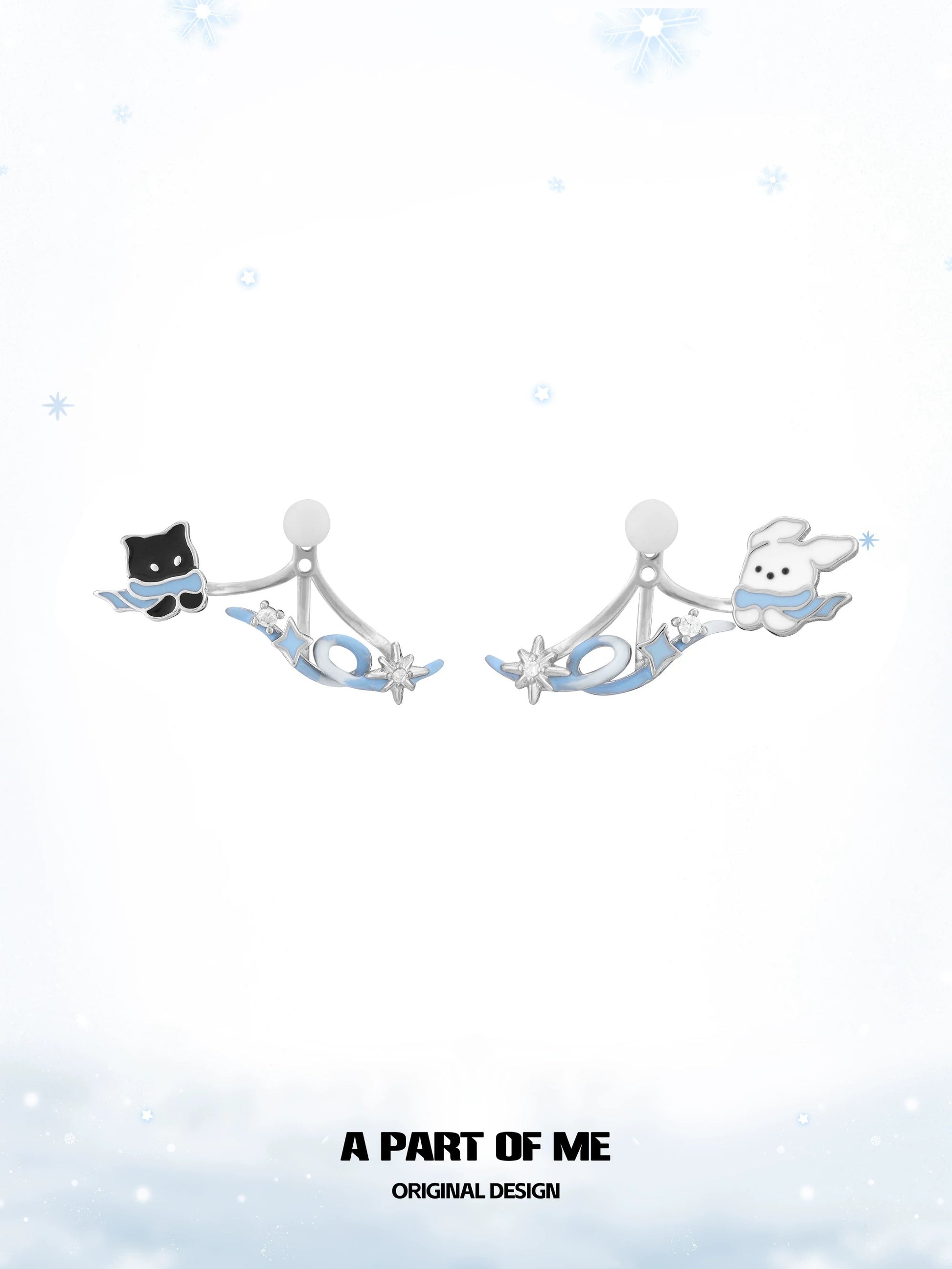 Windy Black Cat & White Dog 18K Platinum Plating Detachable Earrings